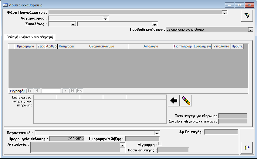 Χρησιμοποιώντας το πλήκτρο με το βέλος μεταφέρονται οι επιλεγμένες κινήσεις στην θέση «Επιλεγμένες κινήσεις για πληρωμή» και το ποσό τους προστίθεται στο ποσό της επιταγής που θα δημιουργηθεί.