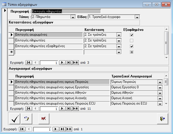 Στην οθόνη αυτή συμπληρώνουμε τους τύπους αξιογράφων που χρησιμοποιεί η εταιρεία (π.χ Επιταγές πληρωτέες, Επιταγές Εισπρακτέες κλπ).