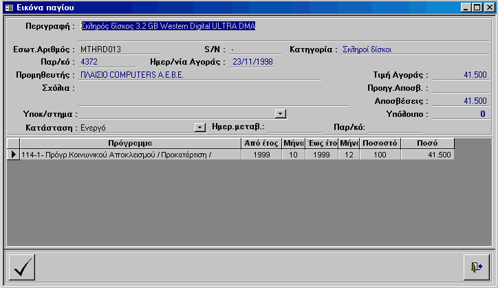 Για κάθε πάγιο μπορείτε με το πλήκτρο «Εικόνα παγίου» να προβάλλετε την ακόλουθη οθόνη στην οποία φαίνονται τα πλήρη στοιχεία του παγίου και το ιστορικό αποσβέσεών του.