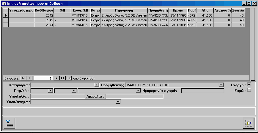 Η φόρμα αυτή έχει διπλή χρήση. Αφ’ ενός είναι χρήσιμη για την περιήγηση με την χρήση έξυπνων φίλτρων στα πάγια, αφετέρου στην διενέργεια αποσβέσεων. Και στις δύο περιπτώσεις με την χρήση του φίλτρου μπορείτε να επιλέξετε τα πάγια που επιθυμείτε να εμφανιστούν.