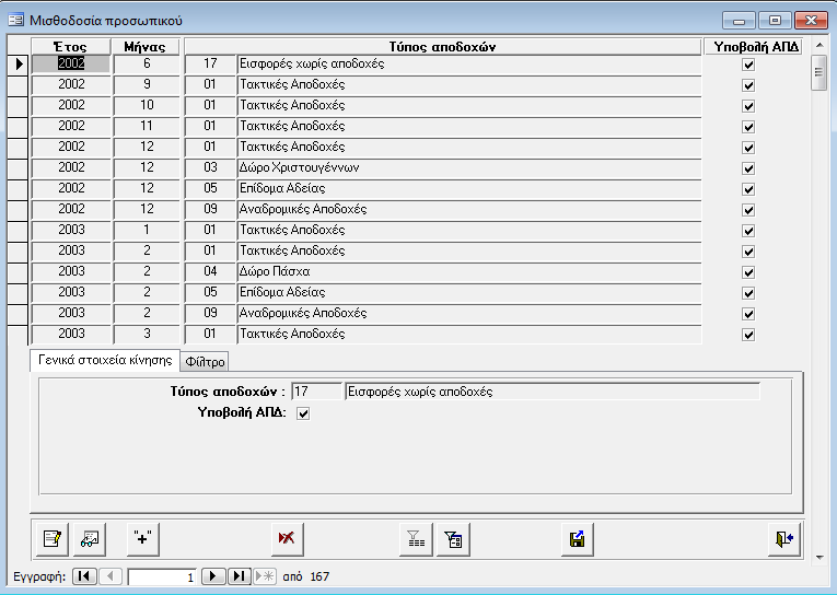 Στην οθόνη αυτή εμφανίζεται μία λίστα των κινήσεων (περιόδων) της μισθοδοσίας προσωπικού που υπακούουν στα φίλτρα που έχουν οριστεί στην σελίδα «Φίλτρο».