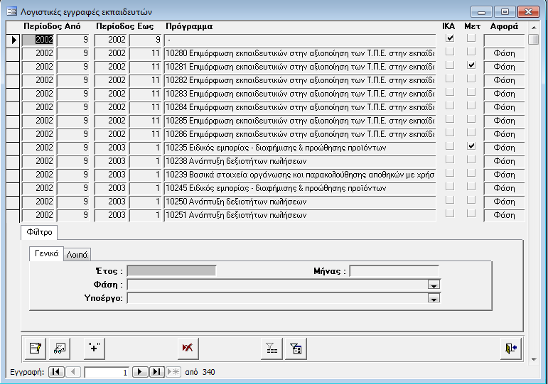 Στην οθόνη αυτή εμφανίζεται μία λίστα των ομάδων λογιστικών εγγραφών των εκπαιδευτών που υπακούουν στα φίλτρα που έχουν οριστεί στην σελίδα «Φίλτρο».