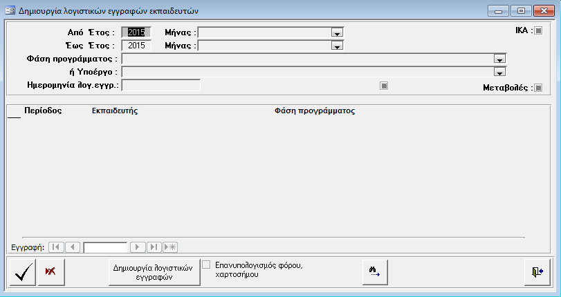 Στην οθόνη αυτή γίνεται η δημιουργία των λογιστικών εγγραφών των εκπαιδευτών από τα δεδομένα της εκπαιδευτικής διαχείρισης.