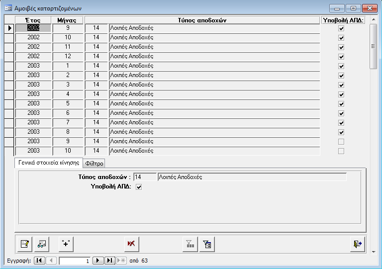 Στην οθόνη αυτή εμφανίζεται μία λίστα των κινήσεων αμοιβών των καταρτιζομένων που υπακούουν στα φίλτρα που έχουν οριστεί στην σελίδα «Φίλτρο».