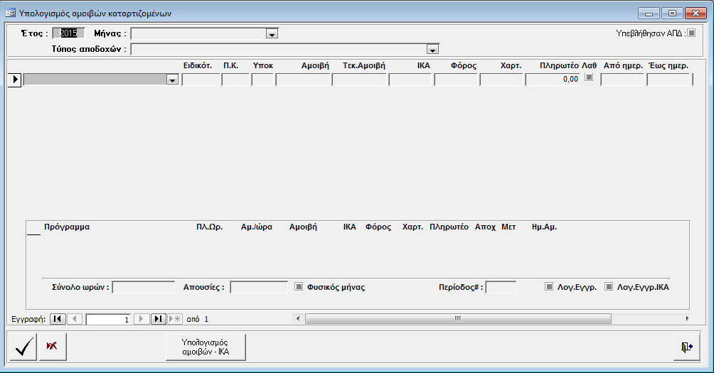 Στην οθόνη αυτή γίνεται ο υπολογισμός των αμοιβών των καταρτιζομένων από τα δεδομένα της εκπαιδευτικής διαχείρισης.
