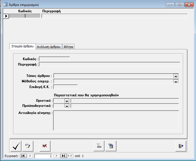 Στην οθόνη αυτή καταχωρούνται τα στοιχεία των άρθρων επιμερισμού που θα χρησιμοποιηθούν για την μεταφορά των ποσών από την Γενική στην Αναλυτική Λογιστική.
