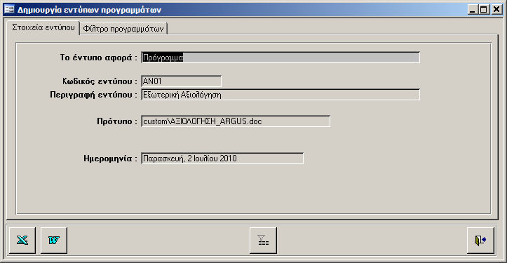 Π.χ. αν πρόκειται για header «Πρόγραμμα», εμφανίζεται η παραπάνω οθόνη στην οποία συμπληρώνουμε στοιχεία επαρκή για την επιλογή του καταλλήλου προγράμματος για το οποίο θα δημιουργηθεί το έντυπο.