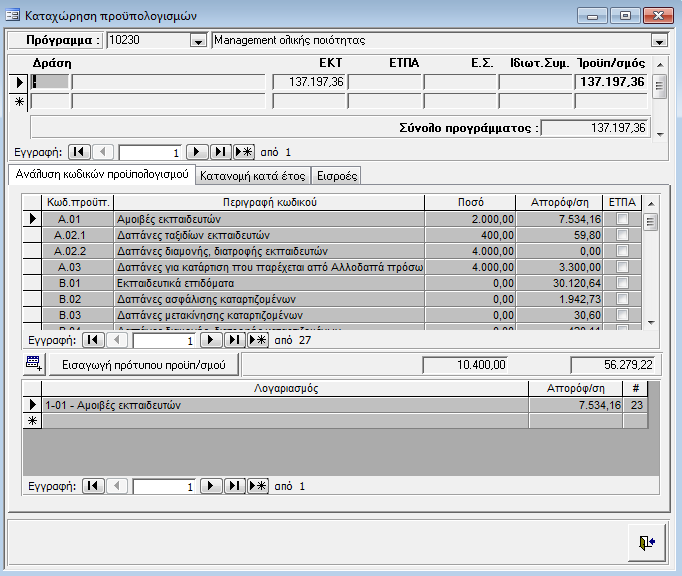 Η εφαρμογή συμπληρώνει αυτόματα την στήλη Απορρόφηση ανάλογα με την ανάλυση των δαπανών στα προγράμματα.