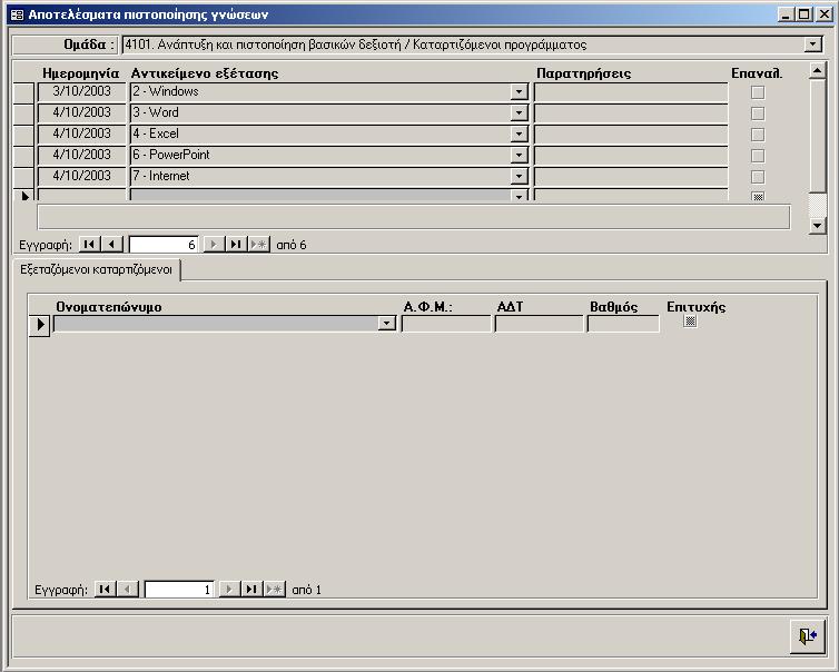 Στην οθόνη αυτή καταχωρούνται τα αποτελέσματα των εξετάσεων για την πιστοποίηση γνώσεων των καταρτιζομένων.