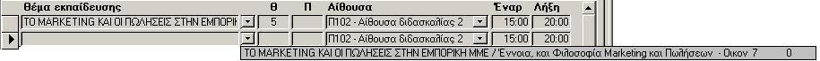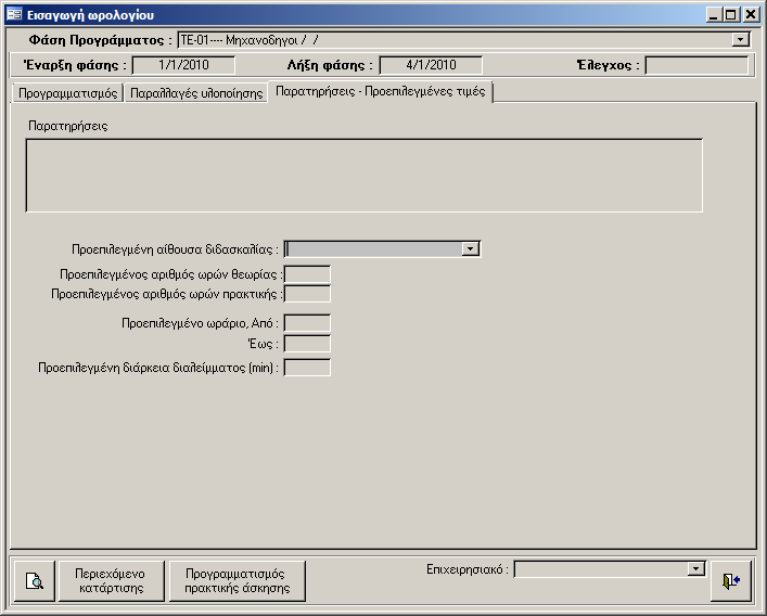 - Έναρξη, Λήξη. Η ώρα έναρξης και λήξης του μαθήματος.(Τα πεδία αυτά πρέπει να συμπληρώνονται σε 24ωρη μορφοποίηση και η διαφορά τους πρέπει να δίνει τις ώρες που συμπληρωμένες στο Θ ή στο Π.)