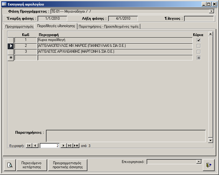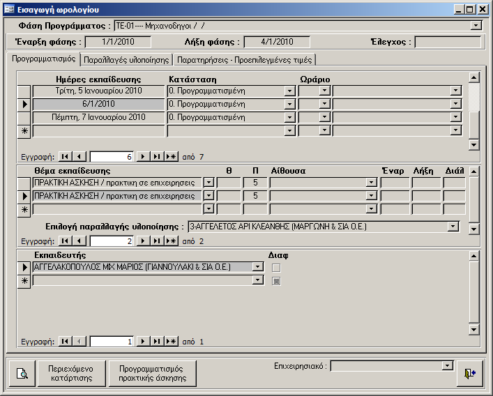 - Επιλογή παραλλαγής υλοποίησης. (Χρησιμοποιούνται σε θέματα πρακτικής σε επιχείρηση, όταν δεν έχουν το ίδιο ωράριο όλες οι εταιρείες που συμμετέχουν στην πρακτική άσκηση καταρτιζομένων ή όταν δεν εργάζονται τις ίδιες ημέρες.)