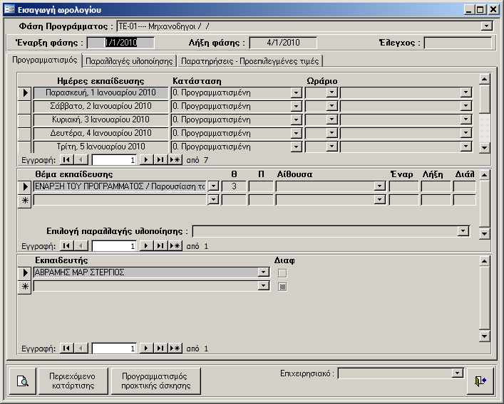 - Κατάσταση. (Η κατάσταση του ωρολογίου για αυτή την ημέρα.Η εφαρμογή συμπληρώνει αυτόματα την κατάσταση «0. Προγραμματισμένη» όταν γίνεται η αρχική καταχώρηση. Μετά την ολοκλήρωση της ημέρας ο χρήστης, αφού ελέγξει ότι όλα τα στοιχεία είναι σωστά πρέπει να αλλάζει την κατάσταση σε «1. Υλοποιήθηκε»)