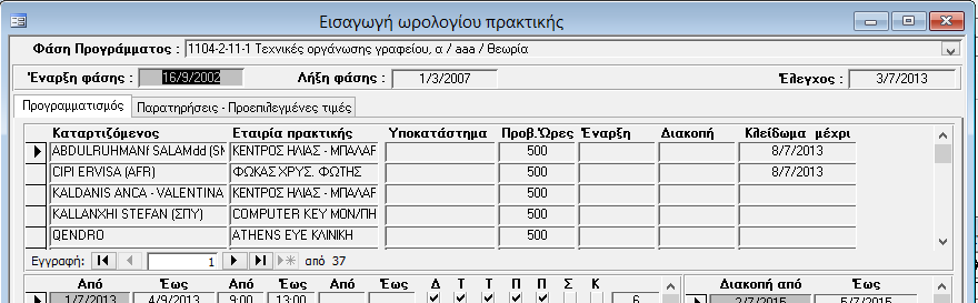 1. Κλειδώνουμε το ωρολόγιο πρακτικής του συγκεκριμένου καταρτιζόμενου μέχρι και την τελευταία ημέρα πρακτικής στην προηγούμενη εταιρία