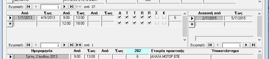 Στο δεξιό μέρος, στα πεδία διακοπή από και έως, μπορείτε να καταχωρήσετε περιόδους διακοπής της πρακτικής. Έτσι το σύστημα αυτόματα δεν θα αναπτύξει ωρολόγιο στις περιόδους αυτές.