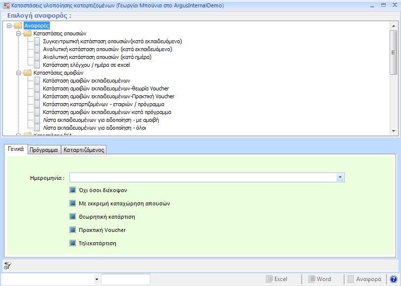 Από την οθόνη αυτή μπορούμε να πάρουμε μία ποικιλία εκτυπώσεων που αφορούν καταρτιζόμενους, με βάση τα στοιχεία που θα ορίσουμε στο φίλτρο.