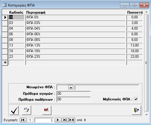 Στην οθόνη αυτή καταχωρούμε τις κατηγορίες Φ.Π.Α. των ειδών.