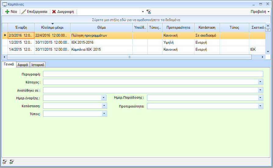 Στην φόρμα "Καμπάνιες" μπορείτε να χρησιμοποιήσετε το φίλτρο αναζήτησης ώστε να εισάγοντας τα επιθυμητά κριτήρια, να προβάλλετε στην λίστα τις υπάρχουσες καταγεγραμμένες καμπάνιες ή να δημιουργήσετε μια νέα.