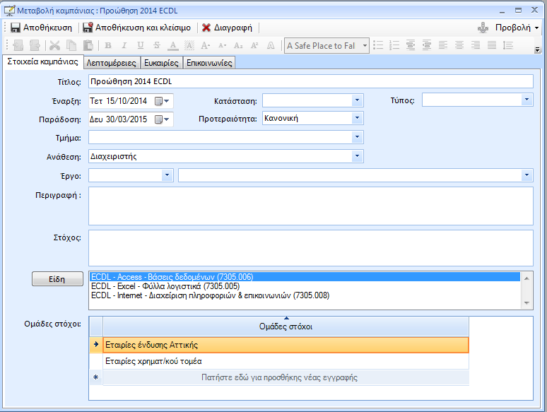 Στην καρτέλα αυτή επεξεργάζεστε τις ευκαιρίες τις καμπάνιας.