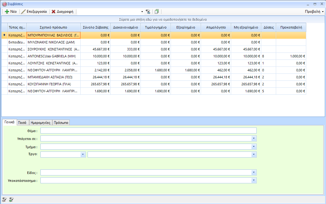 Στην παρακάτω φόρμα, μπορείτε να περιηγηθείτε στις συμβάσεις. Από εδώ μπορείτε να εισάγετε με το κουμπί "Νέο" νέα σύμβαση,
