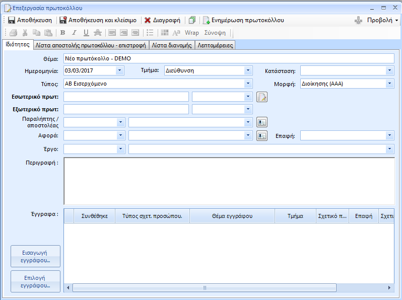 Εισαγωγή εγγράφων στο πρωτόκολλο
