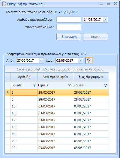 Είτε κάνοντας διπλό κλικ σε κάποιο διαθέσιμο πρωτόκολλο, ενημερώνεται το πεδίο Αριθμός πρωτοκόλλου με τον αριθμό αυτό και επιλέγεται η ημερομηνία "από", είτε συμβουλεύεστε την λίστα και πληκτρολογείτε τον αριθμό πρωτοκόλλου που θέλετε στο αντίστοιχο πεδίο. Στη συνέχεια, κάνοντας κλικ στο κουμπί "Εισαγωγή", το παράθυρο κλείνει και εισάγεται ο επιλεγμένος αριθμός και ημερομηνία στην φόρμα.