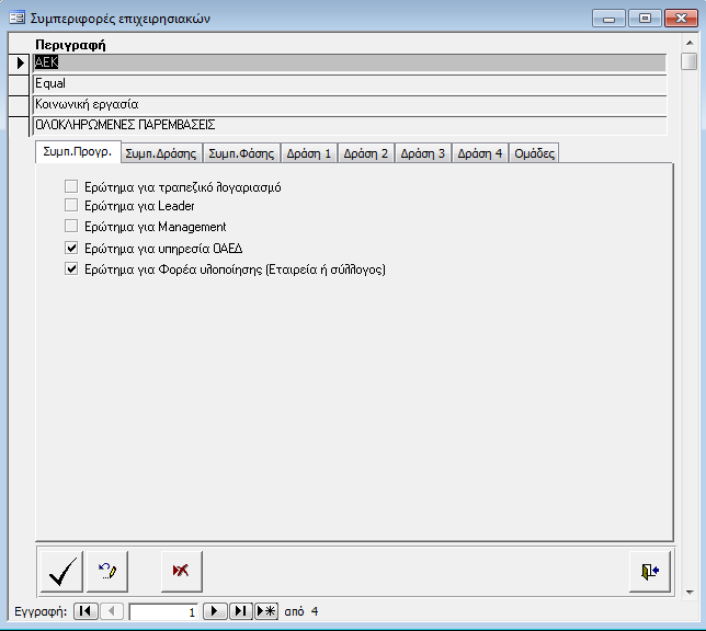 - Ερώτημα για Επιχειρήσεις Πρακτικής (αν το πεδίο «Επιχειρήσεις Πρακτικής» θα είναι ορατό ή όχι στην οθόνη καταχώρησης δράσης)