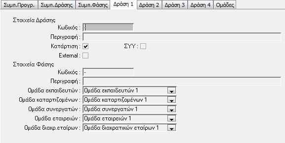 Στις σελίδες «Δράση 1 (έως 4)» καταχωρούνται τα στοιχεία για την αυτόματη δημιουργία έως 4 δράσεων με μία φάση η κάθε μία, οι οποίες θα δημιουργούνται αυτόματα κατά την καταχώρηση νέου προγράμματος και θα συνδέονται με αυτό.