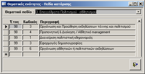 Στην οθόνη αυτή καταχωρούνται τα στοιχεία των Πεδίων Κατάρτισης για κάθε ένα Θεματικό Πεδίο.