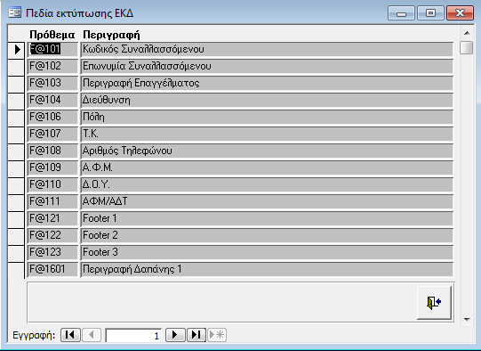 Στην οθόνη αυτή εμφανίζονται για πληροφοριακούς λόγους τα πεδία που χρησιμοποιούνται για τον σχεδιασμό της φόρμας εκτύπωσης των ΕΚΔ.