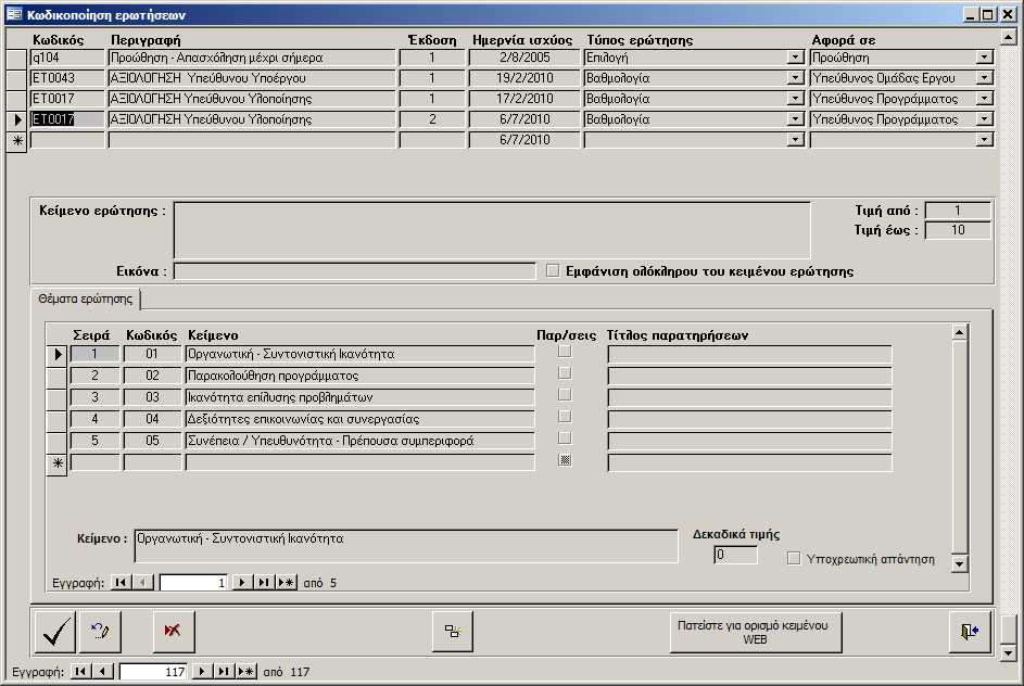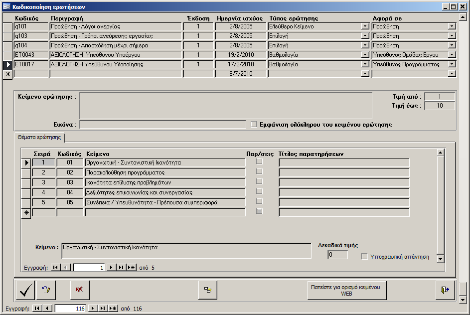 Στην διαδρομή προγράμματα-εργαλεία-παράμετροι εργαλείων-κωδικοποίηση ερωτήσεων, ορίζουμε τις ερωτήσεις οι οποίες θα συνθέσουν το ερωτηματολόγιο επιλογής.