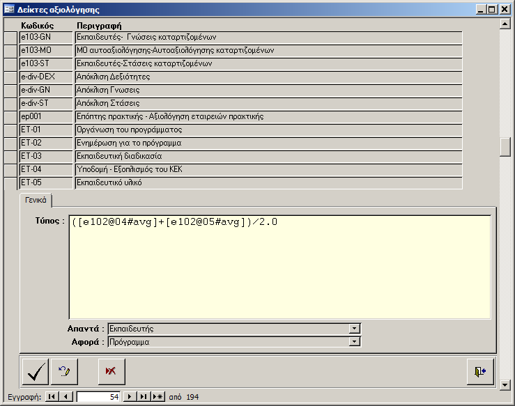 Οι δείκτες αξιολόγησης είναι πεδία αποθήκευσης αποτελεσμάτων επεξεργασίας των απαντήσεων στα ερωτηματολόγια αξιολόγησης και ορίζονται παραμετρικά. Μπορούν να ενσωματωθούν τόσο ως πεδία συγχώνευσης (Merge Fields) σε παραμετρικά έντυπα, οσο και στην έκθεση υλοποιηθέντος προγράμματος.