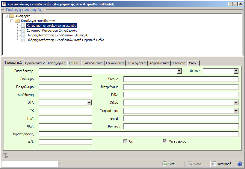 Οι «Καταστάσεις» Εκπαιδευτών αφορούν καταλόγους οι οποίοι υπακούν στα φίλτρα που έχει ορίσει ο χρήστης.
