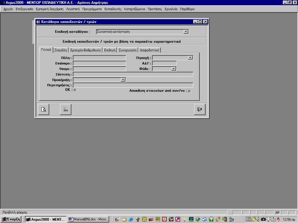 Στην φόρμα αυτή μπορούμε με χρήση φίλτρων να προβάλλουμε ή να εκτυπώσουμε μια ποικιλία καταστάσεων στοιχείων εκπαιδευτών.