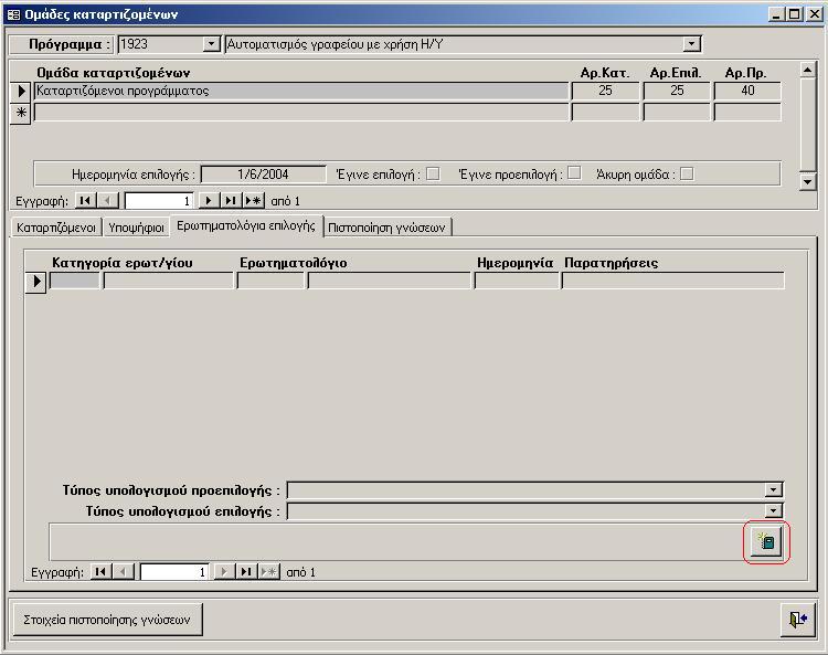 - Όταν γίνεται σε ένα στάδιο, τότε όλοι οι υποψήφιοι απαντούν όλα τα ερωτηματολόγια και επιλέγονται τόσοι όσοι έχουν δηλωθεί στην ομάδα στο πεδίο «Αριθμός Καταρτιζομένων».