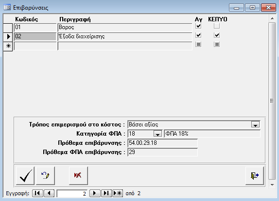 Στην οθόνη αυτή καταχωρούνται οι Επιβαρύνσεις που χρησιμοποιούνται στα παραστατικά Αγορών και Πωλήσεων.