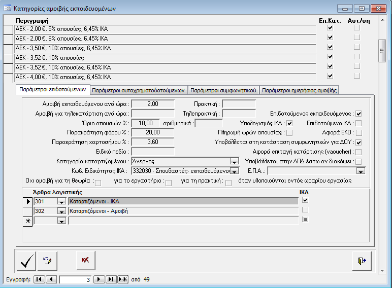 Στην οθόνη αυτή συμπληρώνουμε τις κατηγορίες αμοιβής των καταρτιζομένων.