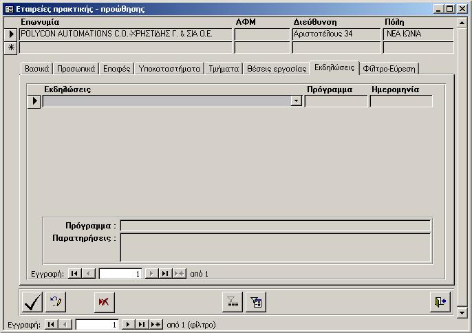 - Εκδήλωση. Η εκδήλωση στην οποία συμμετείχε η εταιρεία.(Τα στοιχεία λαμβάνονται από πίνακα ο οποίος είναι διαθέσιμος με την εργασία Καταρτιζόμενοι-Προώθηση στην Απασχόληση-Εκδηλώσεις δραστηριότητες Προώθησης).