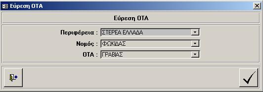 - ΟΤΑ: Ζητείται ο Οργανισμός Τοπικής Αυτοδιοίκησης. Ο ΟΤΑ λαμβάνεται από πίνακα ο οποίος είναι συμπληρωμένος από την εφαρμογή. Ο χρήστης μπορεί μόνο να δει τον πίνακα, χωρίς να μπορεί να κάνει μεταβολές, με την εργασία Προγράμματα-Παράμετροι προγραμμάτων-Γεωγραφικά δεδομένα-ΟΤΑ.