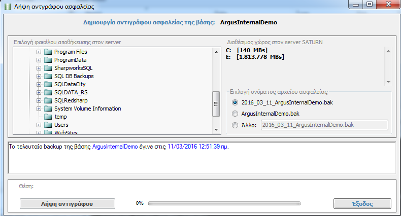 - Να επιλέξετε τον φάκελο στον οποίο θα αποθηκεύσετε το αντίγραφο ασφαλείας της βάσης σας. (Σημείωση: Τον φάκελο αποθήκευσης τον επιλέγετε από τους δίσκους του sql server στον οποίο φιλοξενείται η βάση δεδομένων και όχι από τον τοπικό σταθμό εργασίας).
