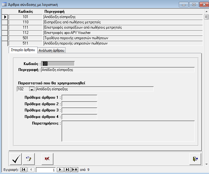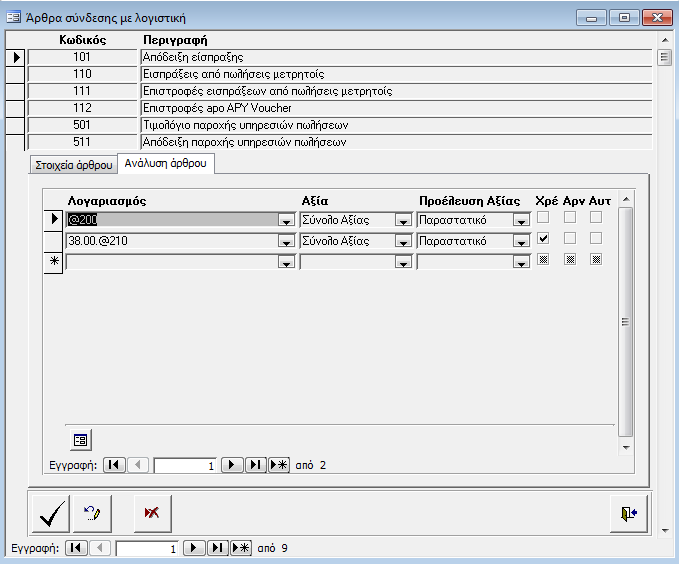 Στην οθόνη αυτή καταχωρούνται τα Άρθρα σύνδεσης της Εμπορικής Διαχείρισης με την Λογιστική. Για κάθε Άρθρο συμπληρώνουμε: