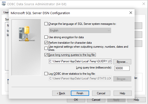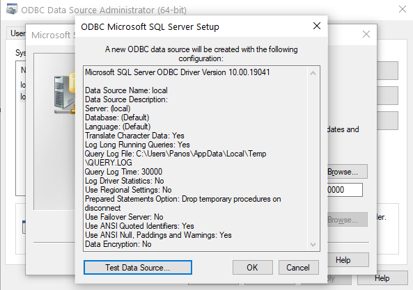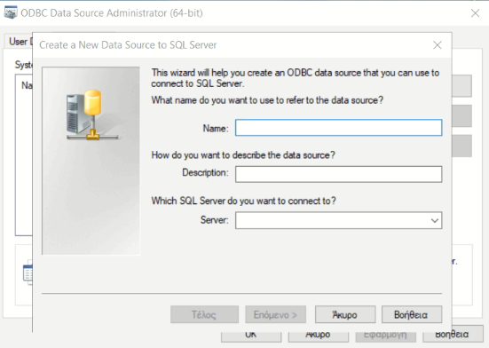 Σημείωση: Εάν χρησιμοποιείτε 64bit λειτουργικό σύστημα και συνδέεστε σε SQL Server 32bit, θα πρέπει να ανοίξετε την παραπάνω φόρμα, όχι από τον πίνακα ελέγχου, αλλά εκτελώντας το αρχείο C:\Windows\SysWOW64\odbcad32.exe. Εάν κατά την παραγωγή εντύπων Word παρουσιάζεται σφάλμα, δημιουργείστε επίσης ένα DSN συστήματος (64bit), με τον παραπάνω τρόπο από τον πίνακα ελέγχου, με το ίδιο όνομα και στοιχεία σύνδεσης όπως δώσατε και εδώ.