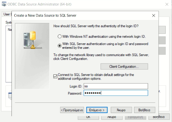 Στην οθόνη επικύρωσης της σύνδεσης με τον SQL Server, επιλέξτε Έλεγχο ταυτότητας από τον διακομιστή SQL με τη βάση και εισάγετε ένα έγκυρο username και password σύνδεσης με τον sever (π.χ. sa). Πατήστε επόμενο.