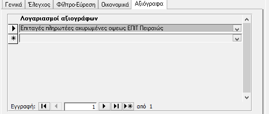 Ειδικά για τους λογαριασμούς αυτούς εμφανίζεται στην οθόνη μία επί πλέον σελίδα (Αξιόγραφα) στην οποία πρέπει να συμπληρώσετε τους λογαριασμούς αξιογράφων (από το κύκλωμα αξιογράφων) που ανήκουν στον επιλεγμένο λογαριασμό της Γενικής Λογιστικής.