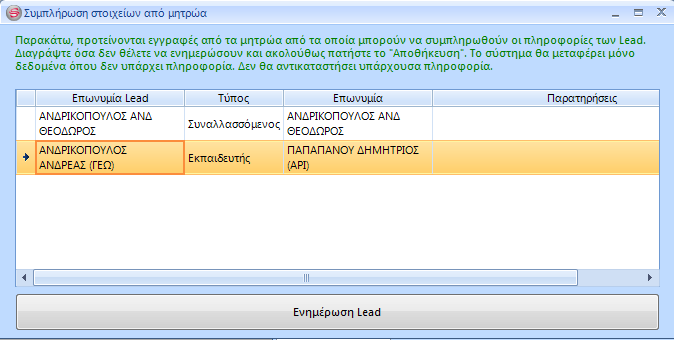 Στην συνέχεια, κάνοντας κλικ στο κουμπί Ενημέρωση Lead, γίνεται εισαγωγή δεδομένων (στα πεδία που δεν υπάρχει πληροφορία) από την εγγραφή του μητρώου που επιλέξατε, στην αντίστοιχη εγγραφή του μητρώου των Leads.