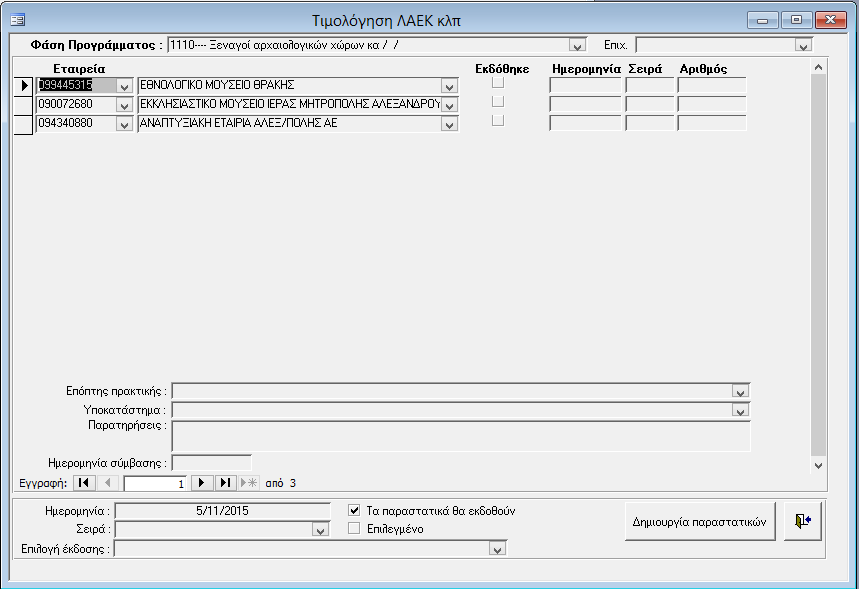 Στην παρακάτω φόρμα, μπορείτε να επιλέξετε και να δημιουργήσετε παραστατικά τιμολόγησης που αφορούν τιμολόγηση σε εταιρίες (πχ ΛΑΕΚ ή άλλα αυτοχρηματοδοτούμενα προγράμματα).
