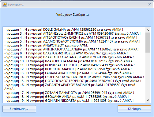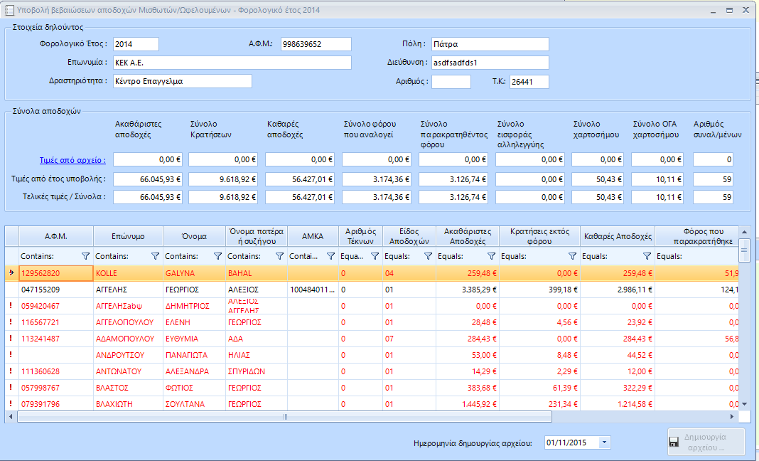 Εάν επιλέξετε την δημιουργία του αρχείου, θα ανοίξει η φόρμα δημιουργίας αρχείου στην οποία θα βλέπετε το σύνολο των ποσών αλλά και αναλυτικά τις εγγραφές. Εδώ θα εμφανιστούν και τα όποια πιθανά σφάλματα μπορεί να έχετε (όπως π.χ. κενό ΑΜΚΑ, κτλ).