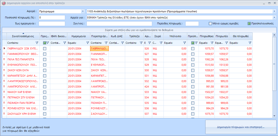 Προβάλλεται η παρακάτω φόρμα, και ακολούθως συλλέγει την λίστα των ανεξόφλητων προς πληρωμή υποχρεώσεων προς τους καταρτιζόμενους του συγκεκριμένου προγράμματος.