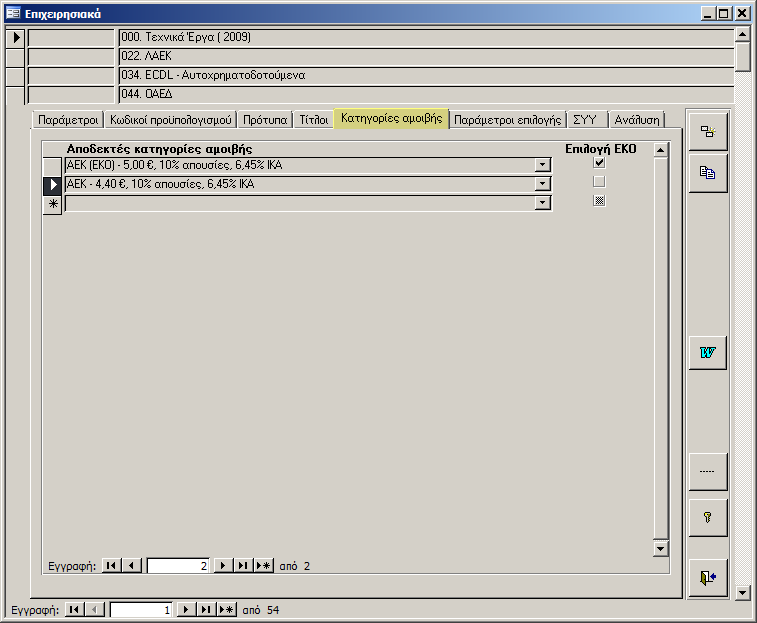 Στην σελίδα «Κατηγορίες αμοιβής» ορίζουμε τις κατηγορίες αμοιβής που θα ισχύσουν για το επιχειρησιακό. Τσεκάροντας της επιλογή ΕΚΟ, συνδέουμε ολους τους καταρτιζόμενους που έχουν στον μητρώο τους στην καρτέλα «κοινωνικά» μια ομάδα ΕΚΟ, με την κατηγορία αμοιβής αυτή. Οι αποδεκτές κατηγορίες αμοιβής αντλούνται από τον πίνακα που ορίζεται στην διαδρομή Καταρτιζόμενοι/Ωφελούμενοι-παράμετροι-κατηγορίες αμοιβής καταρτιζομένων.