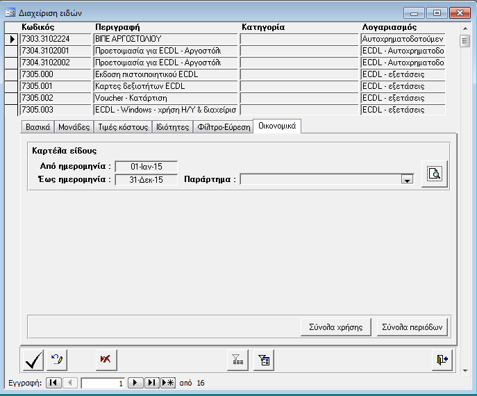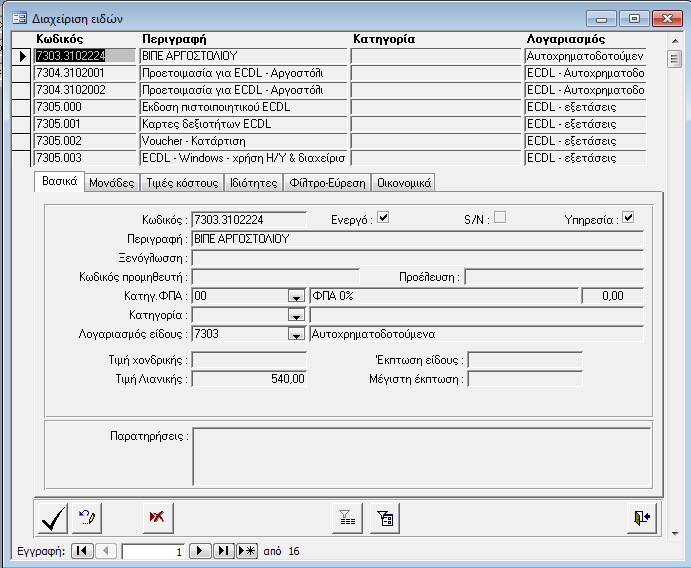 Η επιλογή της ενότητας «Διαχείριση ειδών» εμφανίζει την αντίστοιχη οθόνη στην οποία καταχωρούνται τα είδη της αποθήκης και αποτελείται από τέσσερις σελίδες: