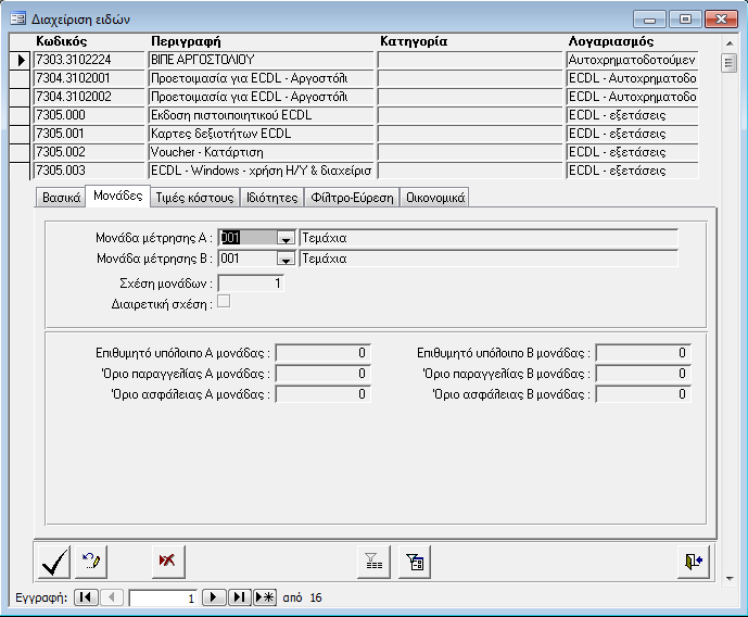 «Βασικά» - «Μονάδες» - «Τιμές κόστους» - «Οικονομικά»